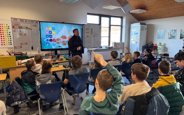 Am Donnerstag war die Polizei zu Besuch in der 3. und 4. Klasse. In einer anschaulichen und kindgerechten Runde erzählte Herr Pusch von den vielfältigen Aufgaben der Polizei. Dabei erklärte er, welche unterschiedlichen Einheiten es gibt und wofür sie zuständig sind. Besonders wichtig war auch das Thema Notruf: Die Kinder lernten, wann und wie man den Notruf wählt und welche Informationen dabei wichtig sind.